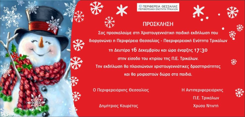 Σας προσκαλούμε στη Χριστουγεννιάτικη παιδική εκδήλωση που διοργανώνει η Περιφέρεια Θεσσαλίας – Περιφερειακή Ενότητα Τρικάλων, τη Δευτέρα 16 Δεκεμβρίου και ώρα 17:30 στην είσοδο του κτιρίου της Π.Ε. Τρικάλων.