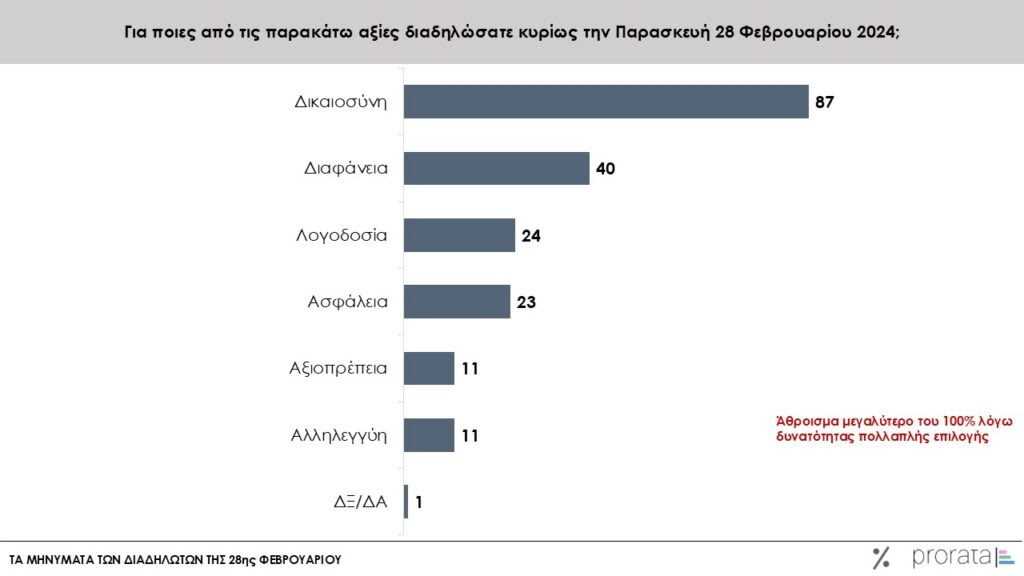 Όσον αφορά τις αξίες με βάσει τις οποίες κινητοποιήθηκαν οι διαδηλωτές, η «Δικαιοσύνη» κυριαρχεί (87%), ενώ ακολουθούν η «Διαφάνεια» (40%), η «Λογοδοσία» (24%), η «Ασφάλεια» (23%), και η «Αξιοπρέπεια» και «Αλληλεγγύη» με 11% αντίστοιχα.