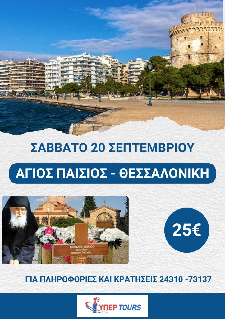 Εκδρομή στον Άγιο Παΐσιο στη Σουρωτή και στη Θεσσαλονίκη διοργανώνει το “ΥΠΕΡTOURS” του ΚΤΕΛ Τρικάλων το Σάββατο 20 Σεπτεμβρίου.