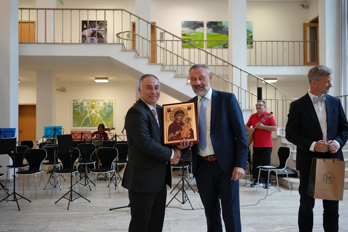Ο μακροβιότερος Βουλευτής κ. Marco Shiemman για άλλη μια φορά δεξιώθηκε όλα τα μέλη της αποστολής και μίλησε με τα πιο τιμητικά λόγια για τον Ελληνικό Πολιτισμό και τη συμβολή του σε όλο τον κόσμο. Οι ορχήστρες μας χάρισαν στους παρευρισκόμενους μια υπέροχη συναυλία και καταχειροκροτήθηκαν . Ακολούθησε η ανταλλαγή δώρων με τον κ Τσιούκα να προσφέρει στο Βουλευτή κ. Marco Shiemman μια εικόνα της Παναγίας της Μετεωρίτισσας και εκείνος με τη σειρά του, του χάρισε ένα μαρμάρινο παράσημο του κοινοβουλίου που συνδέεται με την ιστορία της Σαξονίας.