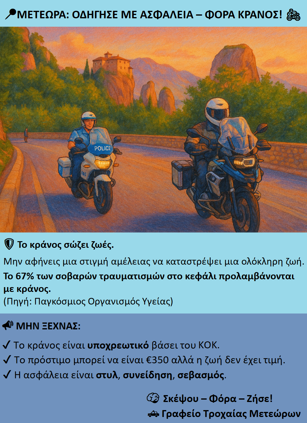 Ενημερωτική δράση, εναρμονισμένη με την, ανά την επικράτεια, εκστρατεία με τίτλο «Μηδενική ανοχή στη μη χρήση κράνους», έλαβε χώρα, χθες, Δευτέρα 11 Αυγούστου, το πρωί, στην Καλαμπάκα, από αξιωματικούς του Αστυνομικού Τμήματος Μετεώρων της Διεύθυνσης Αστυνομίας Τρικάλων.