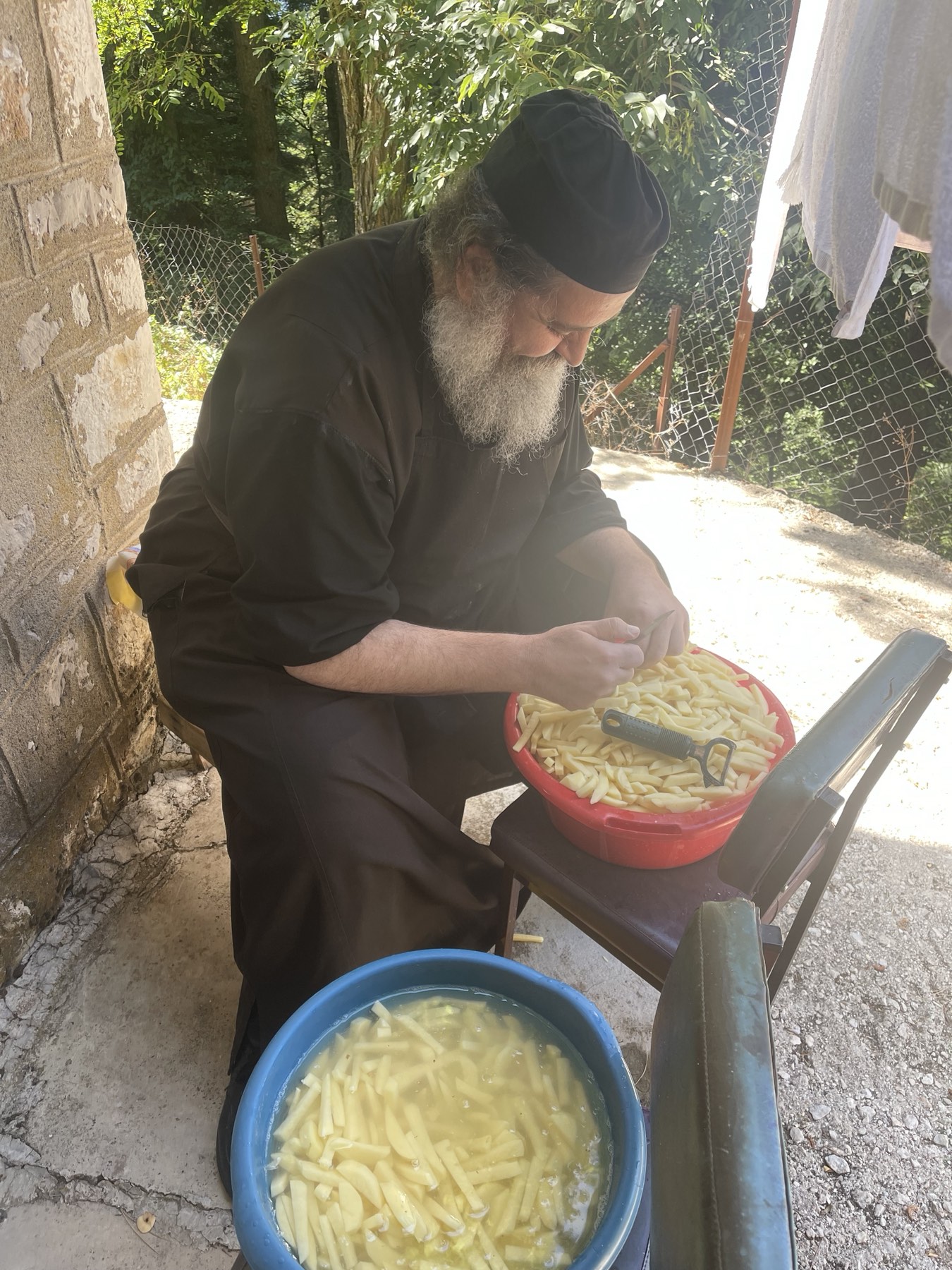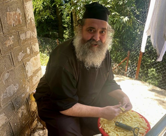 «Μυσταγωγία είναι κι η κουζίνα…». Ο π. Βαρθολομαίος στην κατασκήνωση δεν καθαρίζει απλώς πατάτες. Μιλάει στα παιδιά για τη χαρά της προσφοράς, για το «τραπέζι της αγάπης» που ξεκινάει από το καθάρισμα των λαχανικών και φτάνει μέχρι το πιάτο που θα σερβιριστεί με ευχή και ευλογία.