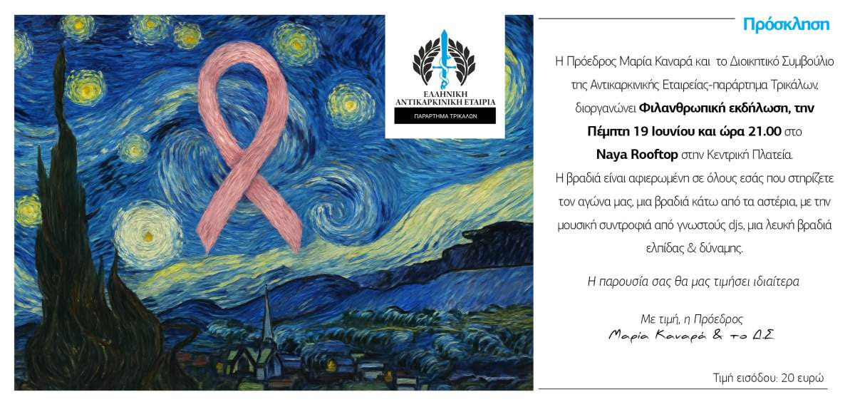Το Διοικητικό Συμβούλιο της Αντικαρκινικής Εταιρείας-παράρτημα Τρικάλων, διοργανώνει την καλοκαιρινή Φιλανθρωπική εκδήλωση, την Πέμπτη 19 Ιουνίου και ώρα 21.00 στο NAYA ROOF TOP [ Taratsa] στην Κεντρική Πλατεία!