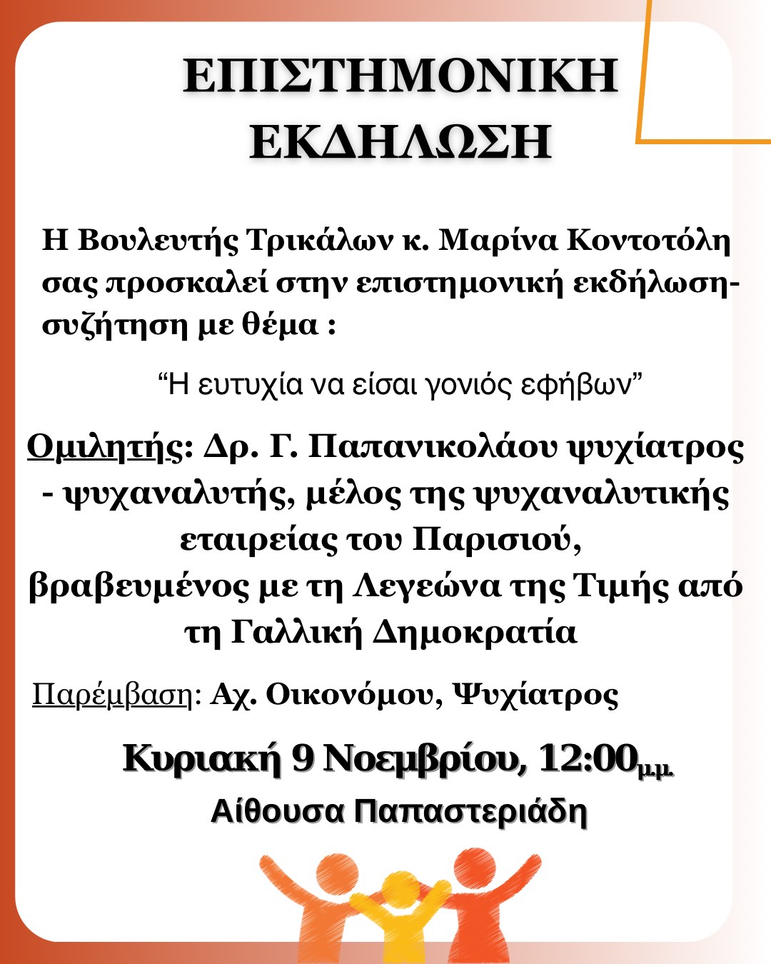 Η Βουλευτής Τρικάλων Μαρίνα Κοντοτόλη διοργανώνει επιστημονική εκδήλωση – συζήτηση με θέμα: «Η ευτυχία να είσαι γονιός εφήβου». Κεντρικός ομιλητής της εκδήλωσης θα είναι ο Δρ. Γεώργιος Παπανικολάου, ψυχίατρος – ψυχαναλυτής, μέλος της Ψυχαναλυτικής Εταιρείας του Παρισιού και τιμηθείς με τη Λεγεώνα της Τιμής της Γαλλικής Δημοκρατίας.