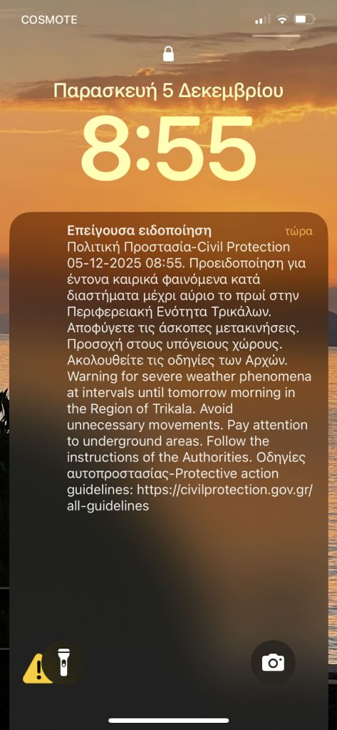 Ήχησε το 112 στα Τρίκαλα το πρωί της Παρασκευής. Προσοχή στις μετακινήσεις συνιστούν οι Αρχές.