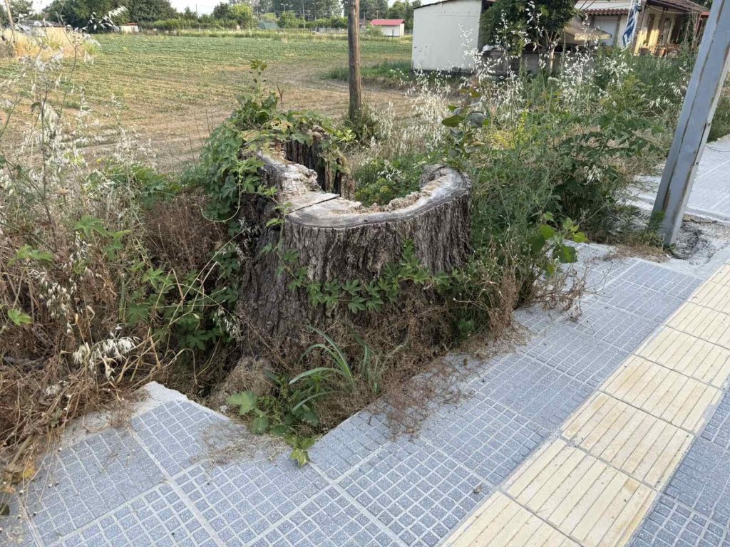 “Ήμαρτον…Βρήκαν ξεραμένο δέντρο και αντί να απομακρύνουν τα υπολείμματα του κορμού έκαναν εσοχή στο πεζοδρόμιο…επιβεβαιώνοντας αυτό που διαπιστώνεται δια γυμνού οφθαλμού, στην ανάπλαση της εισόδου στην οδό Πύλης, όπως άλλωστε και στα περισσότερα έργα που υλοποιούνται στην πόλη: ΑΡΠΑ ΚΟΛΛΑ…