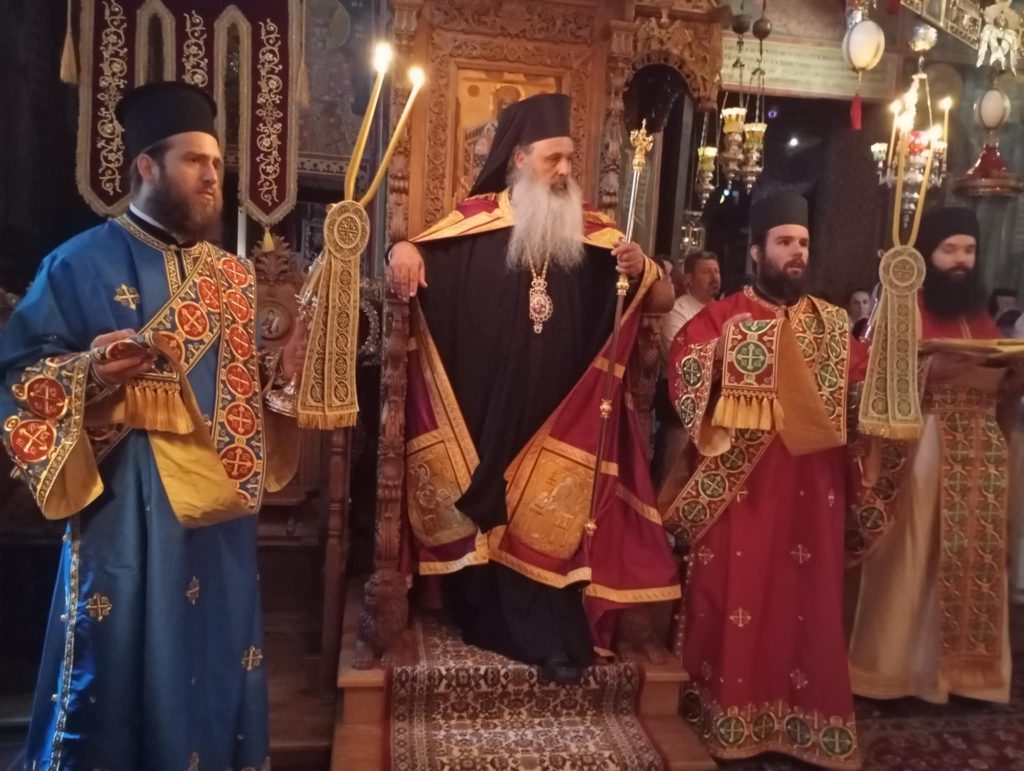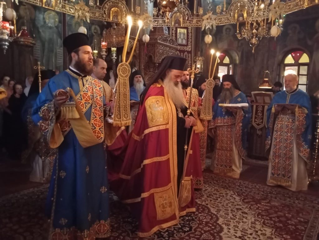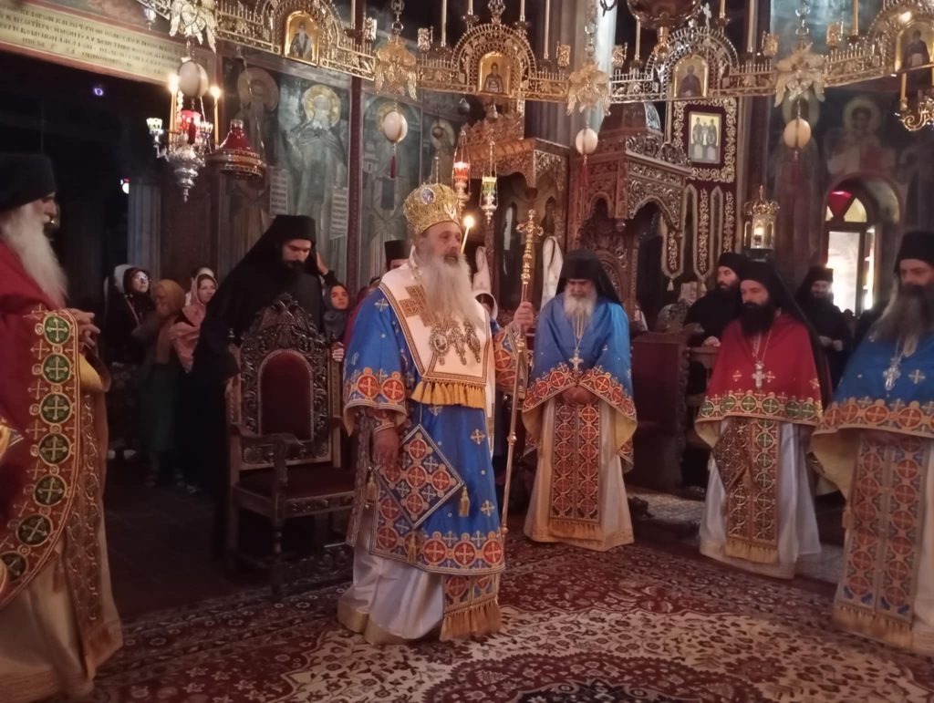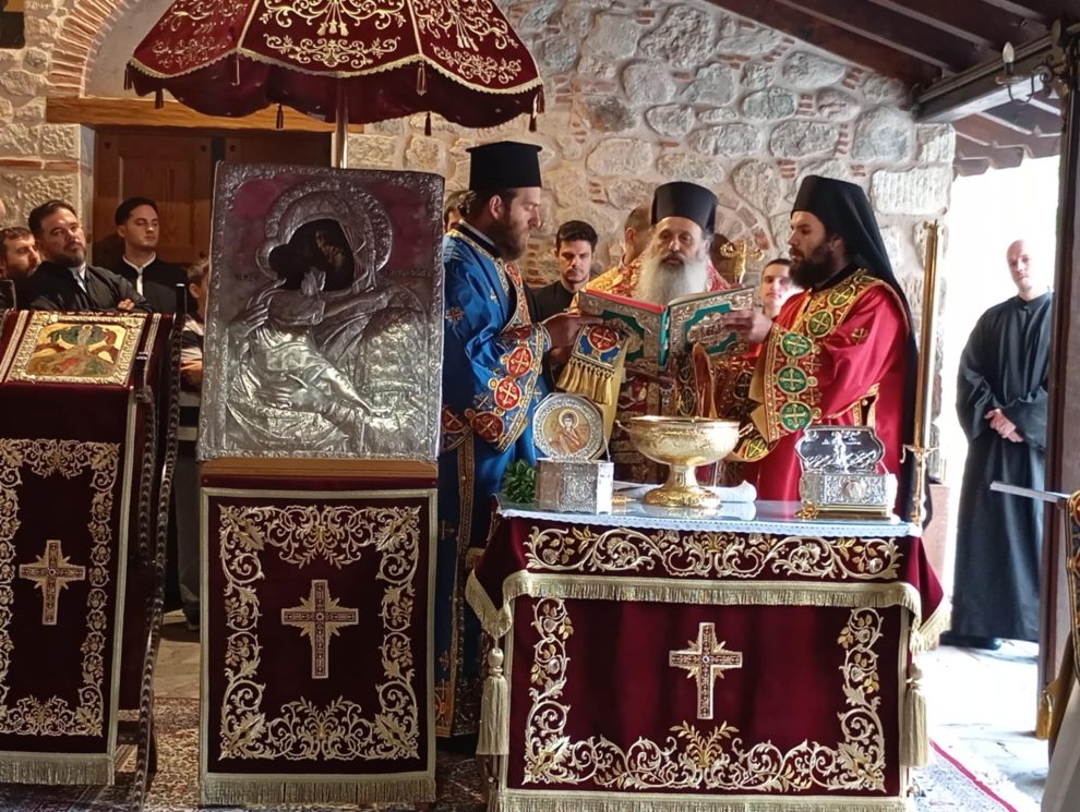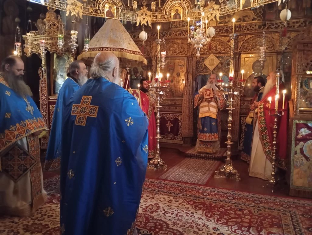 Ο Μητροπολίτης Σταγών Θεόκλητος, ο οποίος και ενδύθηκε των Αρχιερατικών Αμφίων στο σολέα του Καθολικού, προεξήρχε της Θείας Λειτουργίας, συμμετοχή Ηγουμένων της Μητροπόλεώς του.