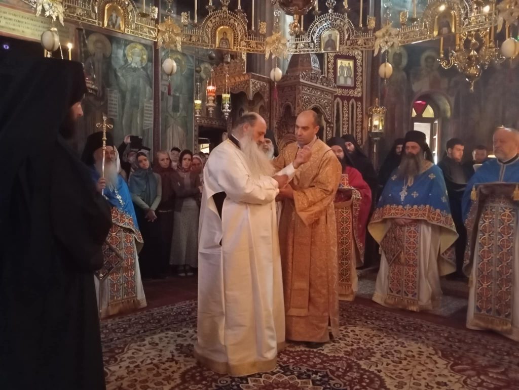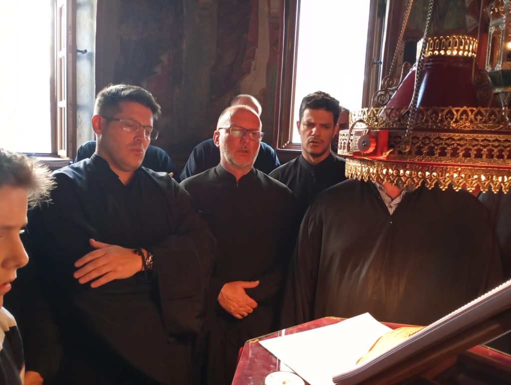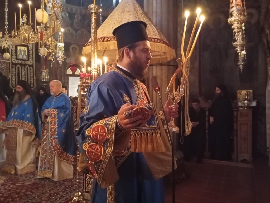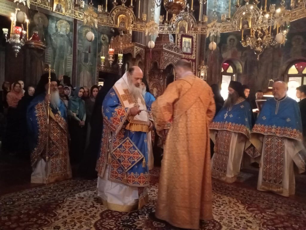 Ο Μητροπολίτης Σταγών Θεόκλητος, ο οποίος και ενδύθηκε των Αρχιερατικών Αμφίων στο σολέα του Καθολικού, προεξήρχε της Θείας Λειτουργίας, συμμετοχή Ηγουμένων της Μητροπόλεώς του.