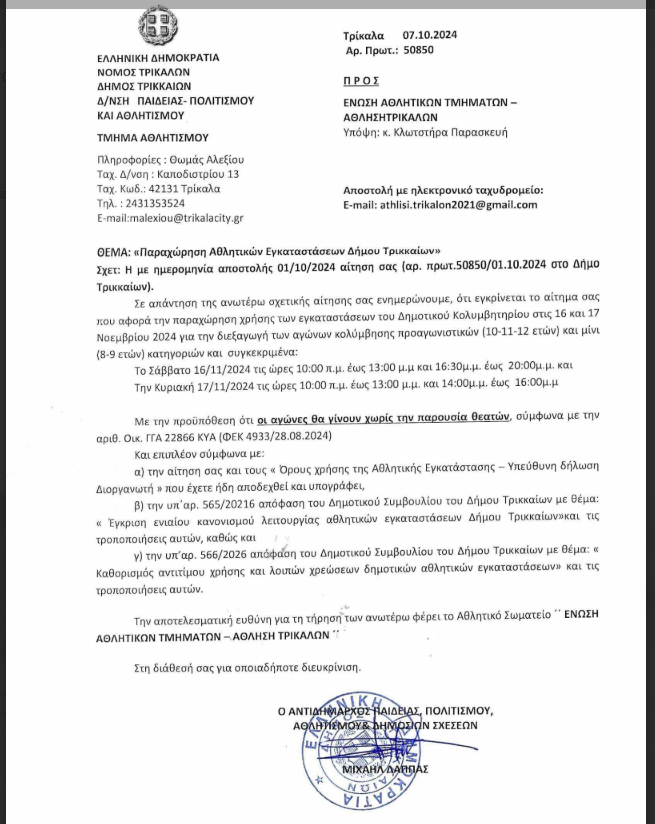 Μάλιστα δέχθηκε τις διαμαρτυρίες των γονέων ο αντιδήμαρχος Μιχάλης Λάππας (ΕΔΩ). Ωστόσο και για να είμαστε δίκαιοι οφείλουμε να σημειώσουμε ότι ο Δήμος Τρικκαίων είχε ενημερώσει εγκαίρως το σωματείο “Άθληση” που διοργάνωνε τους αγώνες ότι του παραχωρεί μεν “άδεια τέλεσης αγώνων” με την ρητή επισήμανση όμως ότι αυτοί θα διεξαχθούν χωρίς την παρουσία θεατών και το καλούσε να ενημερώσει σχετικά. Το trikalavoice.gr αποκαλύπτει σήμερα το σχετικό έγγραφο: