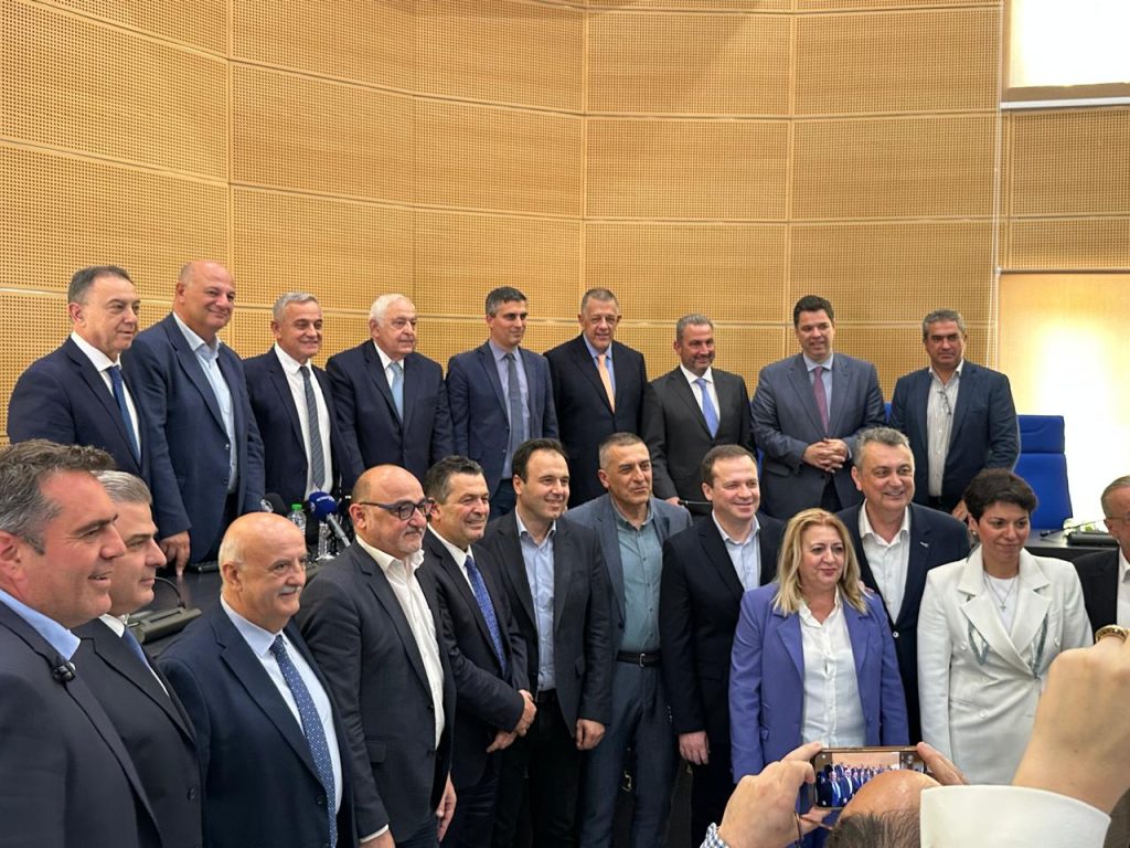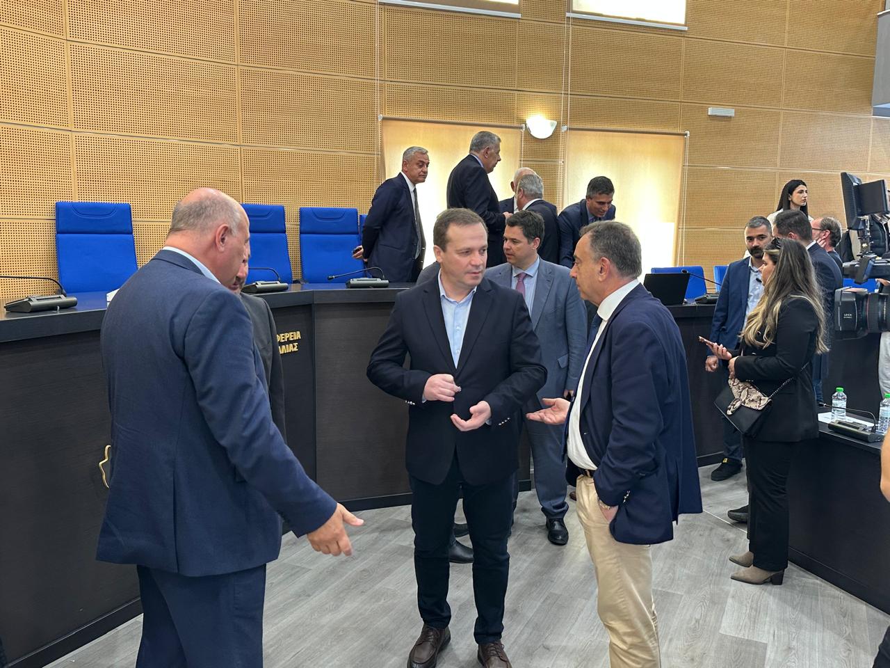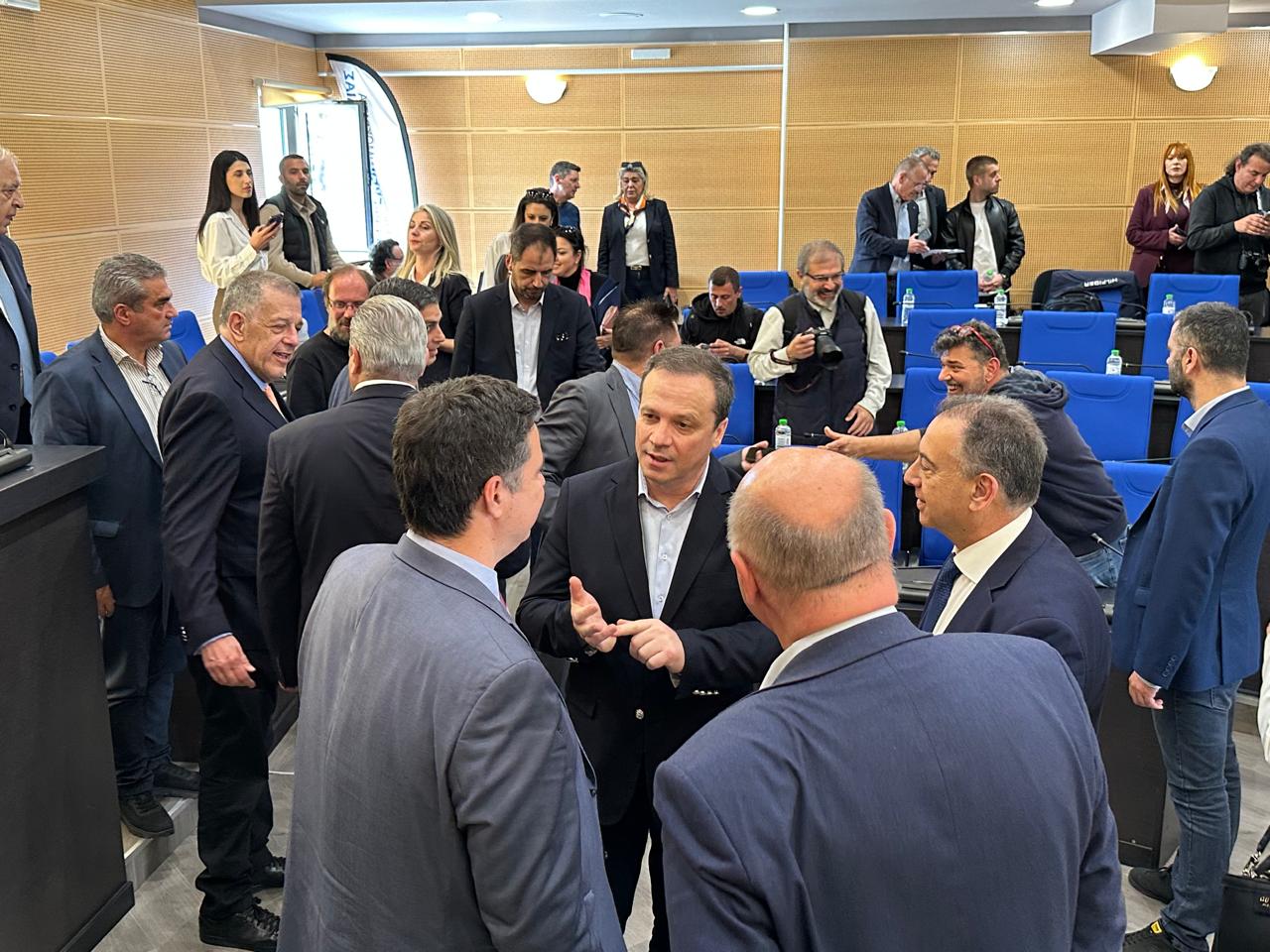 Ακολούθως μετά τη Φαρκαδόνα, το κλιμάκιο, συμπεριλαμβανομένου του κ. Λιούτα, μετέβη στην Λάρισα, όπου στην αίθουσα του Περιφερειακού Συμβουλίου πραγματοποιήθηκε η υπογραφή των συμβάσεων για τα έργα αποκατάστασης υποδομών στην πληγείσα Θεσσαλία.
