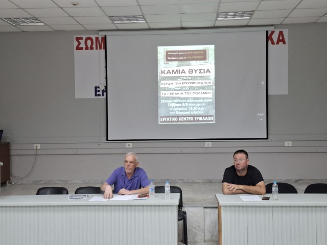 Στη σύσκεψη που πραγματοποιήθηκε με πρωτοβουλία του Εργατικού Κέντρου Τρικάλων με σωματεία και φορείς της πόλης, έγινε συζήτηση για τις εξελίξεις στο μέτωπο της αντιιμπεριαλιστικής δράσης, με αιχμή την γενοκτονία των Παλαιστινίων, καθώς και το αντεργατικό τερατούργημα της κυβέρνησης, για το 13ωρο και τις άλλες ρυθμίσεις που ισοπεδώνουν κάθε εργασιακό δικαίωμα.