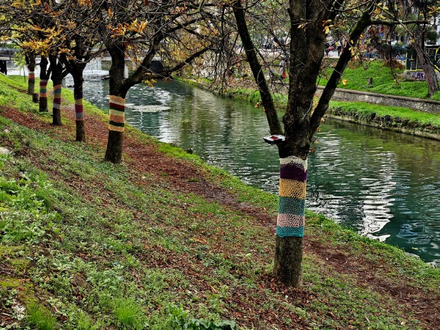 Τα πλεκτά έργα δημιουργήθηκαν στο πλαίσιο δημιουργικής δράσης με τη συμμετοχή παιδιών, τα οποία με ενθουσιασμό, φαντασία και συνεργασία έπλεξαν κομμάτια γεμάτα χρώμα και συναίσθημα. Στη συνέχεια, τα έργα τοποθετήθηκαν στους κορμούς των δέντρων, προσφέροντας μία εικόνα χαράς και ζεστασιάς σε όσους περνούν από το σημείο.