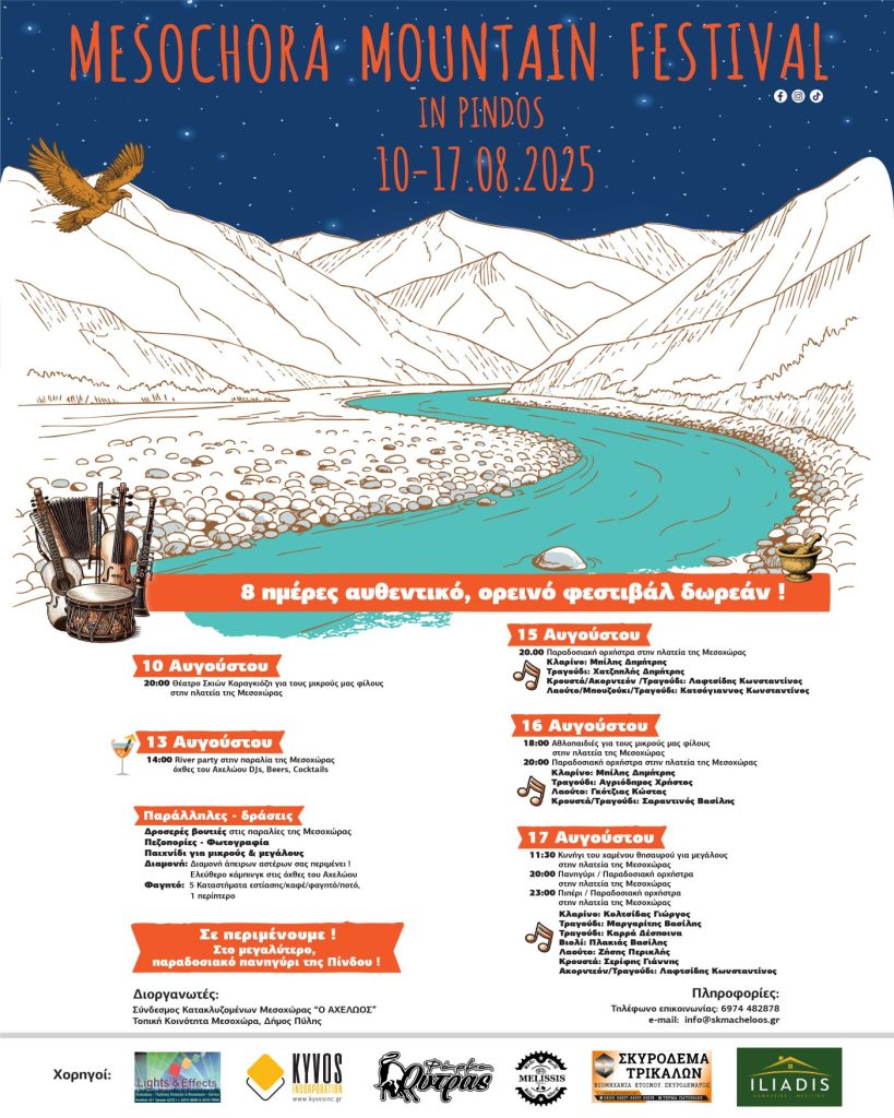 Μια γιορτή ελευθερίας, πολιτισμού και φύσης στην καρδιά της Πίνδου. Η Μεσοχώρα Τρικάλων υποδέχεται και φέτος, για μία ακόμη χρονιά, το Mesochora Mountain Festival – μια εναλλακτική γιορτή που συνδυάζει τη μουσική, την παράδοση και την ανεπιτήδευτη ζωή του βουνού, σε ένα από τα πιο αυθεντικά φυσικά τοπία της Ελλάδας.