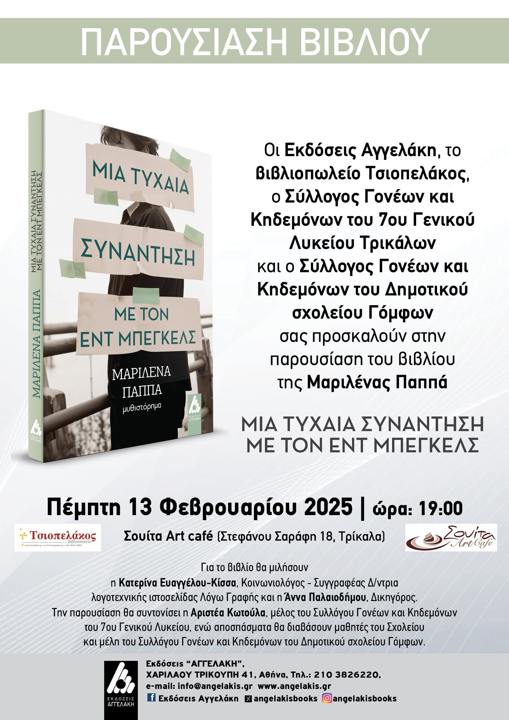 Το feel good μυθιστόρημα της χρονιάς της Μαριλένας Παππά «Μία τυχαία συνάντηση με τον Εντ Μπέγκελς» ταξιδεύει στα Τρίκαλα την Πέμπτη, 13 Φεβρουαρίου. Η παρουσίαση που θα πραγματοποιηθεί στις 19:00 στο φιλόξενο Σουίτα Art café (Στεφάνου Σαράφη 18, Τρίκαλα) συνδιοργανώνουν οι Εκδόσεις Αγγελάκη, το βιβλιοπωλείο Τσιοπελάκος, ο Σύλλογος Γονέων και Κηδεμόνων του 7ου Γενικού Λυκείου Τρικάλων και ο Σύλλογος Γονέων και Κηδεμόνων του Δημοτικού σχολείου Γόμφων.