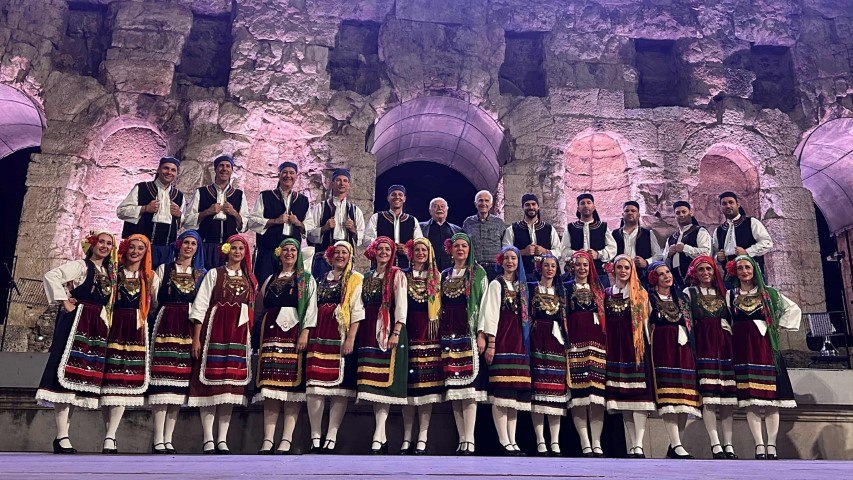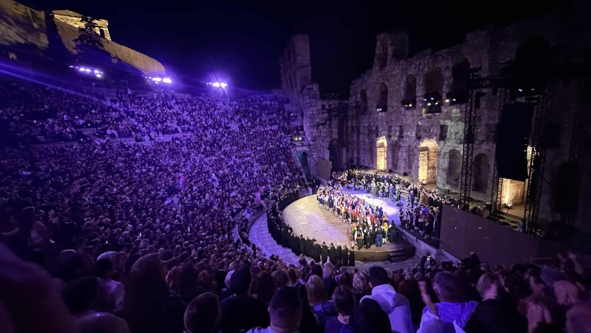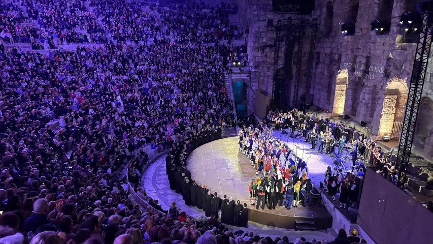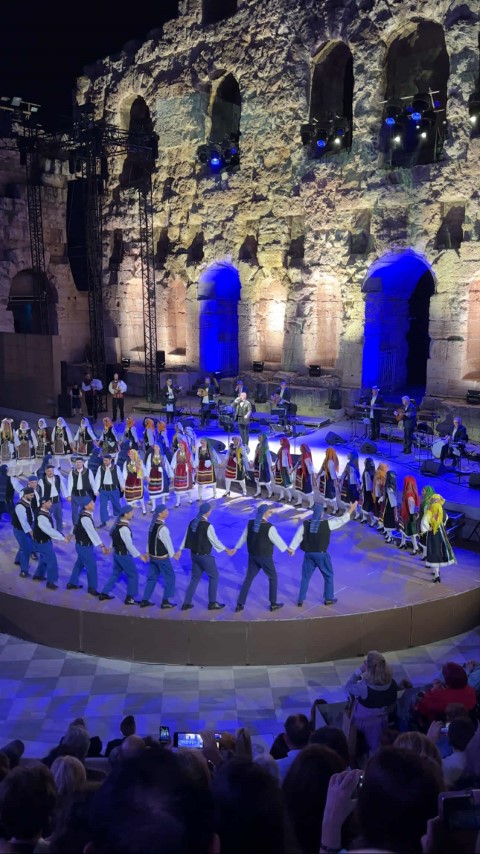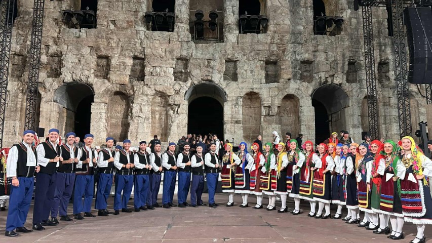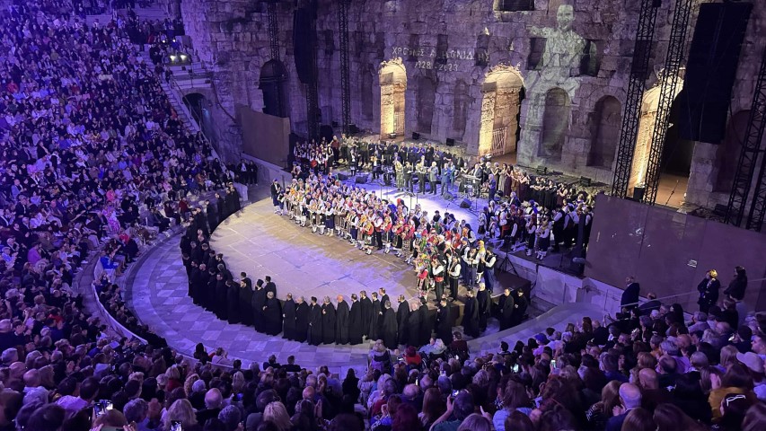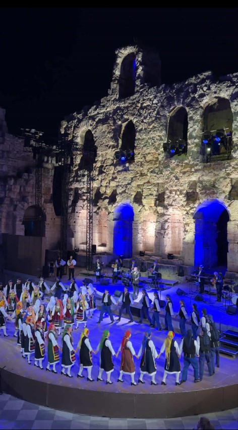 Ωδείο Ηρώδου Αττικού, “Στον Γαλατά ψιλή βροχή..”, 5/10/25. Μια στιγμή ορόσημο για τον Λαογραφικό Χορευτικό Όμιλο Τρικάλων «Ο ΑΣΚΛΗΠΙΟΣ» στο κατάμεστο Ηρώδειο, στη μεγάλη μουσικοχορευτική βραδιά – αφιέρωμα στον Χρόνη Αηδονίδη.