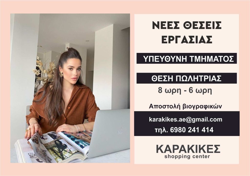 Μόνιμες θέσεις εργασίας στην εταιρεία ΚΑΡΑΚΙΚΕΣ Βασίλης Αλεξίου 9 μήνες ago H ΕΤΑΙΡΕΙΑ ΚΑΡΑΚΙΚΕΣ ΑΝΑΖΗΤΑ να Εντάξει στην ομάδα της νέους ανθρώπους με έφεση στην οργάνωση τμημάτων και αγάπη για τη μόδα!! Μόνιμη εργασία ! Με δυνατότητα εξέλιξης στελεχών στην ανάπτυξη της εταιρείας σε θέσεις ! Ωράριο συνεχόμενο ή σπαστό !