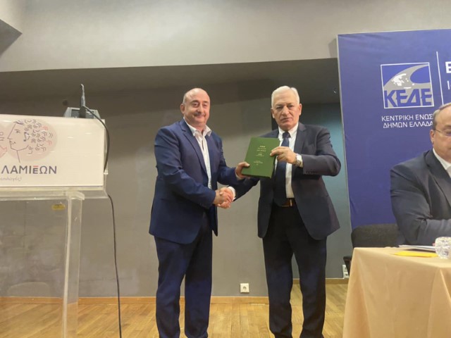 Μετά τον χαιρετισμό του ο πρόεδρος της ΠΕΔ Θεσσαλίας έλαβε τιμητική πλακέτα από τον πρόεδρο της ΚΕΔΕ Λάζαρο Κυρίζογλου.