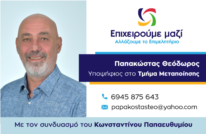 Στη νέα προοπτική του Επιμελητηρίου Τρικάλων στέκεται ο Θοδωρής Παπακώστας ο οποίος κατέρχεται υποψήφιος στο Τμήμα Μεταποίησης στις επικείμενες εκλογές με τον συνδυασμό του Κωνσταντίνου Παπαευθυμίου «Επιχειρούμε Μαζί, Αλλάζουμε το Επιμελητήριο».