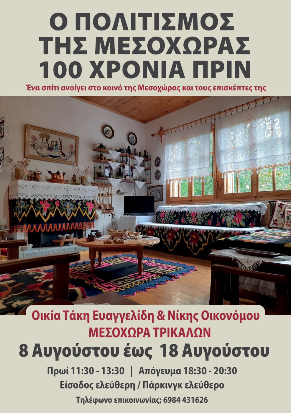 Για 4η συνεχόμενη χρονιά, η έκθεση «Ο Πολιτισμός της Μεσοχώρας 100 Χρόνια Πριν» ανοίγει τις πόρτες της στο κοινό, προσφέροντας ένα μοναδικό ταξίδι στην καθημερινή ζωή και τον πολιτισμό της Μεσοχώρας στις αρχές του 20ού αιώνα.