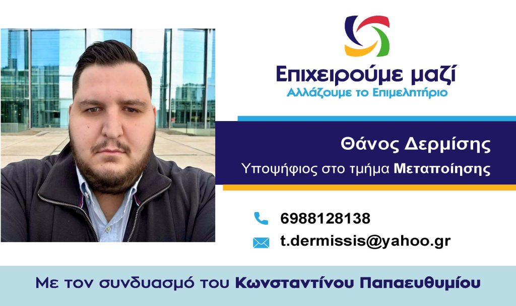 Ένας από τους μεγαλύτερους βιομηχάνους των Τρικάλων ο Θάνος Δερμίσης, ηγετικό στέλεχος της «Μπισκοτοποιίας Δερμίση» που αναπτύσσεται ραγδαία στον κλάδο των τροφίμων τα τελευταία χρόνια, κατακτώντας ολοένα και μεγαλύτερα μερίδια στην αγορά, κατέρχεται υποψήφιος στο Τμήμα Μεταποίησης του Επιμελητηρίου Τρικάλων με τον συνδυασμό “Επιχειρούμε μαζί” του Κωνσταντίνου Παπαευθυμίου.