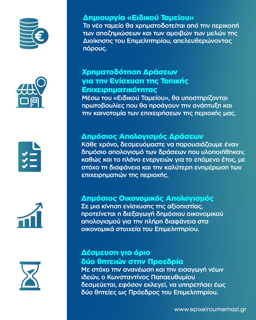 - Δέσμευση για όριο δύο θητειών στην Προεδρία: Με στόχο την ανανέωση και την εισαγωγή νέων ιδεών, ο Κωνσταντίνος Παπαευθυμίου δεσμεύεται, εφόσον εκλεγεί, να υπηρετήσει έως δύο θητείες ως Πρόεδρος του Επιμελητηρίου.