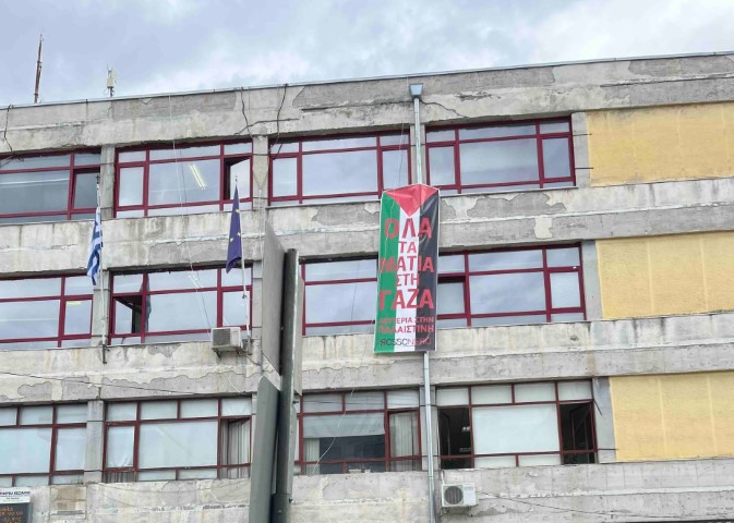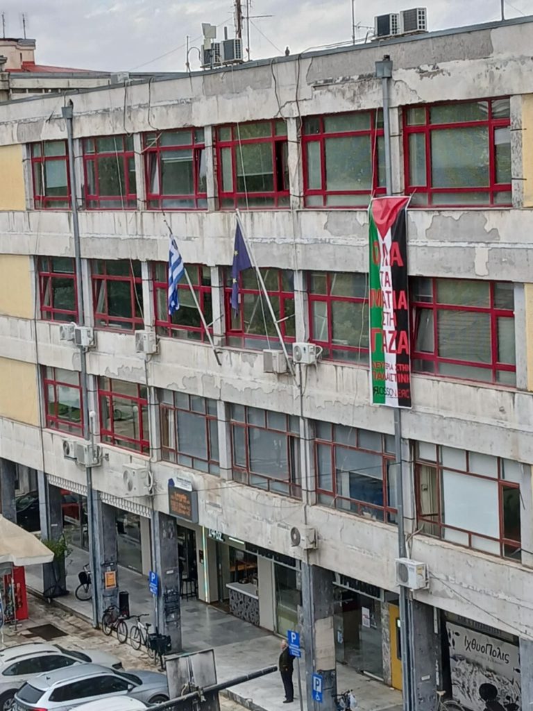 Σήμερα το πρωί, τα μέλη του Αυτοδιαχειριζόμενου Κοινωνικού Χώρου «Rossonero» ανάρτησαν πανό στο κτήριο της Περιφερειακής Ενότητας Τρικάλων σε ένδειξη αλληλεγγύης για τους ακτιβιστές του Global Sumud Flotilla, τα πλοία των οποίων αναχαιτίστηκαν από το Ισραήλ προτού φτάσουν στη Γάζα.