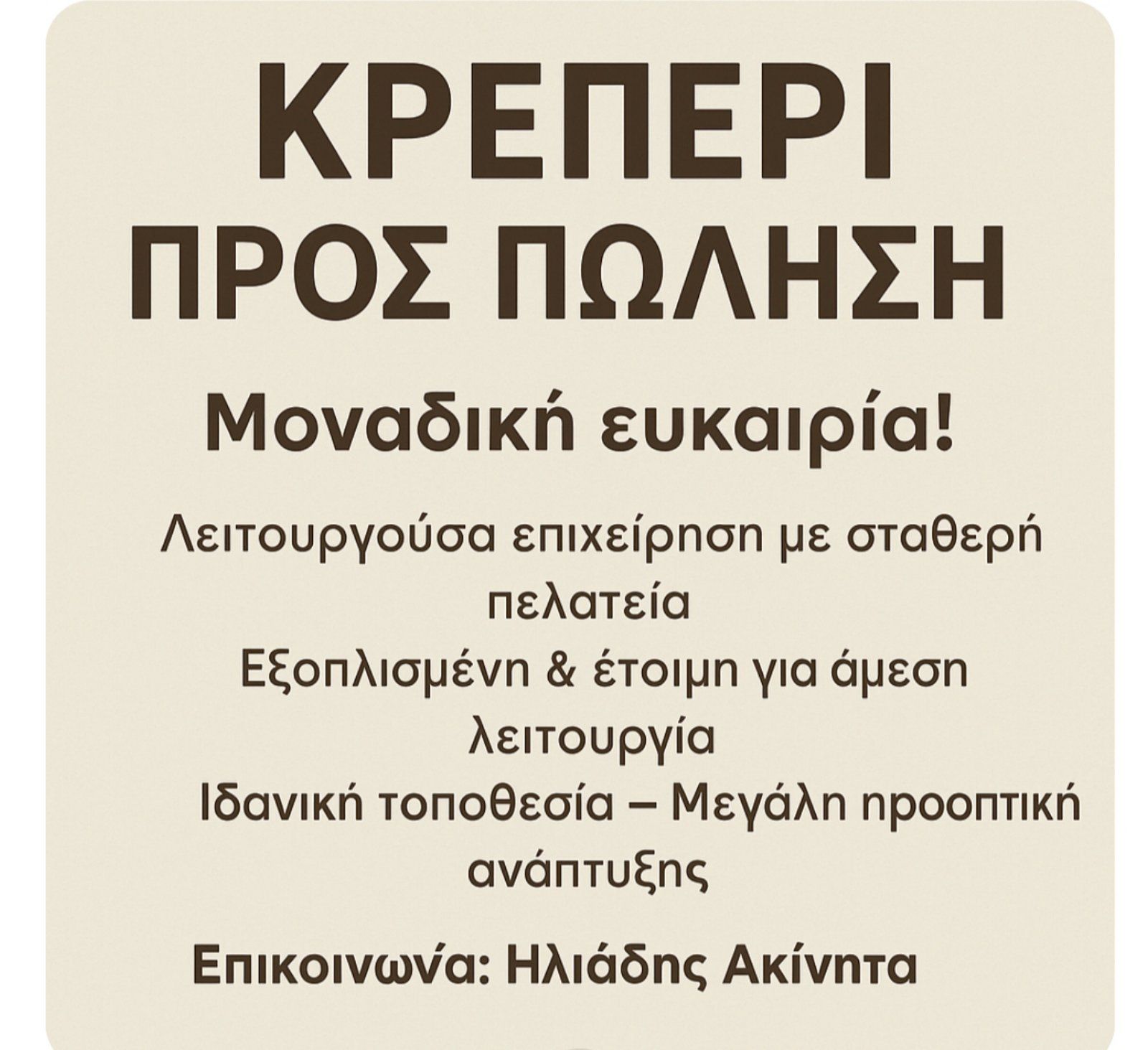 Πωλείται γνωστή κρεπερί των Τρικάλων με σταθερή πελατεία.