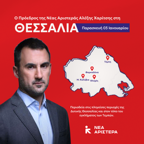 Ακριβώς ένα χρόνο μετά την πρώτη του περιοδεία(2/1/2024) στις πλημμυροπαθείς περιοχές των Περιφερειακών Ενοτήτων Καρδίτσας και Τρικάλων, ο Πρόεδρος της Νέας Αριστεράς, Αλέξης Χαρίτσης επισκέπτεται ξανά τις ίδιες περιοχές μαζί με μέλη της Κεντρικής Επιτροπής και τοπικά στελέχη για να συζητήσουν με κάτοικους, συλλογικότητες και φορείς την κατάσταση σήμερα και την πορεία επίλυσης των προβλημάτων που φαίνεται πως παραμένουν. Μετά την περιοδεία στη Δυτική Θεσσαλία, ο Πρόεδρος της Νέας Αριστεράς θα επισκεφθεί τον τόπο του εγκλήματος στα Τέμπη.