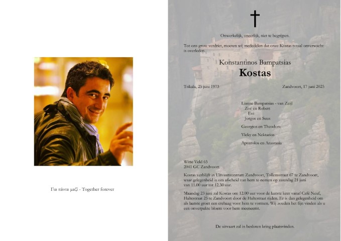 Καθώς η κηδεία του θα γίνει τη Δευτέρα στις 2 μ.μ. ώρα Ελλάδας- 1 μ.μ. τοπική- στο Ζάαντβορτ της Ολλανδίας, όπου έζησε και δημιούργησε και καθώς οι εκατοντάδες φίλοι του από τα Τρίκαλα είναι αδύνατον να μεταβούν εκεί, η οικογένεια δημιούργησε έναν σύνδεσμο απ’ όπου θα μεταδίδεται live η Εξόδιος Ακολουθία του. Μπορούμε όλοι να την παρακολουθήσουμε ΕΔΩ.