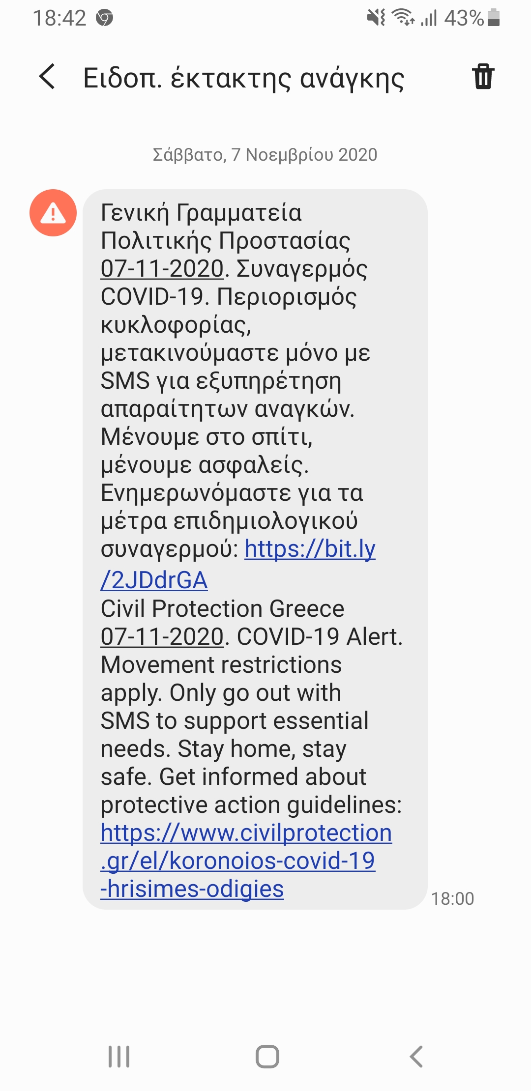 Μέσω αυτών καλούμαστε να συμμορφωθούμε και να περιορίσουμε τις μετακινήσεις μας στο ελάχιστο και στις απολύτως απαραίτητες. Δείτε το μήνυμα παρακάτω: