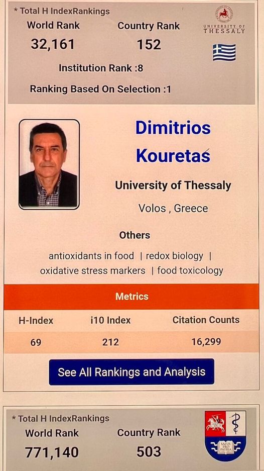Αναλυτικότερα έγραψε: Σύμφωνα με την λίστα AD Scientific Index 2025 που κυκλοφόρησε χθες και αξιολογεί όλους τους ερευνητές παγκοσμίως, βάση του δημοσιευμένου έργου τους διεθνώς και της αναγνώρισης από την διεθνή κοινότητα σε διάφορα επιστημονικά πεδία, του καθένα. Το αποτέλεσμα, στο πεδίο oxidative stress markers, Ranking based on selection, Dimitrios Kouretas, University of Thessaly, Department of biochemistry biotechnology, Greece, Ranking 1.
