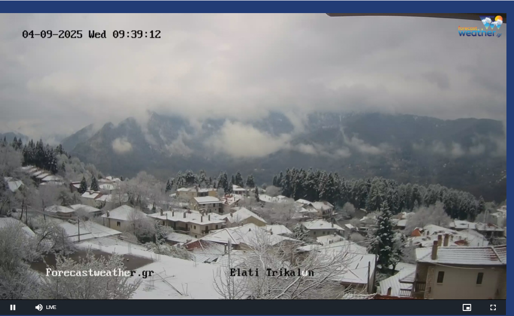 Όπως καταγράφει το trikalavoice.gr από την Ελάτη και πάνω όλα τα χωριά είναι ντυμένα στα λευκά. Δείτε εικόνα live από το forecastweather.gr ΕΔΩ.