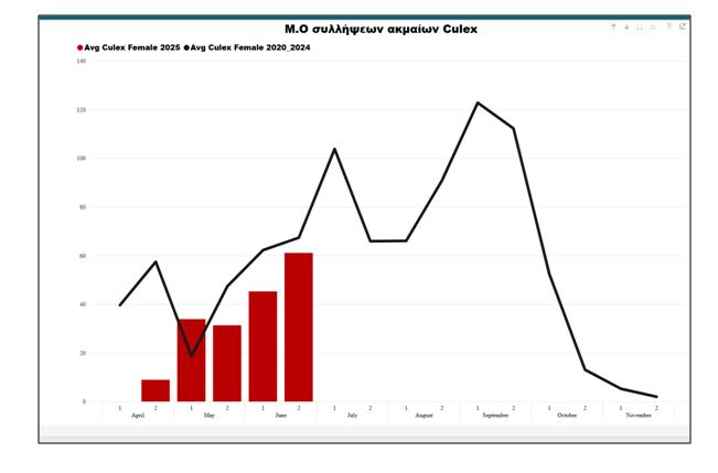 Η Περιφέρεια Θεσσαλίας δίνει στην δημοσιότητα τους δείκτες παρακολούθησης της αφθονίας των ακμαίων κουνουπιών για τα γένη Culex, που ενέχονται στη μετάδοση του ιού του Δυτικού Νείλου, Aedes, στο οποίο οφείλεται το μεγαλύτερο μέρος της όχλησης και Anopheles που ενέχεται στη μετάδοση της ελονοσίας. Τα ιστογράμματα (κόκκινες μπάρες) αντιπροσωπεύουν το μέσο όρο της αφθονίας των 20 δειγματοληπτικών σταθμών συλλογής ακμαίων στην Περιφέρεια της Θεσσαλίας και οι γραμμές αντιπροσωπεύουν το μέσο όρο της τελευταίας πενταετίας για το σταθερό αυτό δίκτυο. Οι συλλήψεις πραγματοποιούνται σε 15ήμερη βάση και το βασικό συμπέρασμα που προκύπτει από τους παρακάτω δείκτες είναι, ότι οι πληθυσμοί των κουνουπιών υψηλής υγειονομικής σημασίας Culex και Anopheles κινούνται στα ίδια ή/και  χαμηλότερα επίπεδα σε σχέση με την προηγούμενη πενταετία. Αντίθετα για το γένος Aedes, κατά το πρώτο 15ήμερο του Μαΐου είχαμε πυκνότητες πληθυσμού 4,6 φορές μεγαλύτερες σε σχέση με την προηγούμενη πενταετία, το δεύτερο 15ήμερο του Μαΐου οι πυκνότητες ήταν 2,5 φορές μεγαλύτερες, και κατά το πρώτο 15ήμερο του Ιουνίου ήταν κατά 4,2 φορές μεγαλύτερες, ενώ για το δεύτερο 15ήμερο του Ιουνίου οι πυκνότητες είναι κατά 2,7 φορές μικρότερες σε σχέση με την προηγούμενη πενταετία.