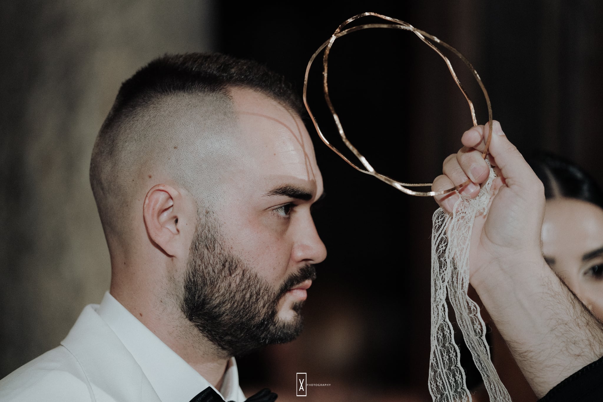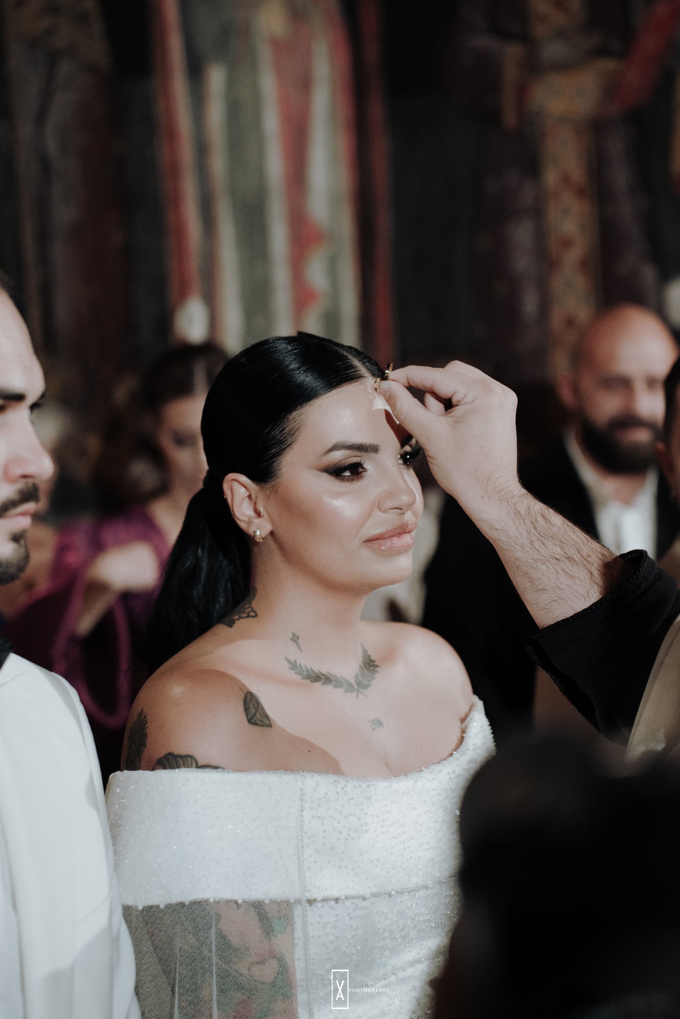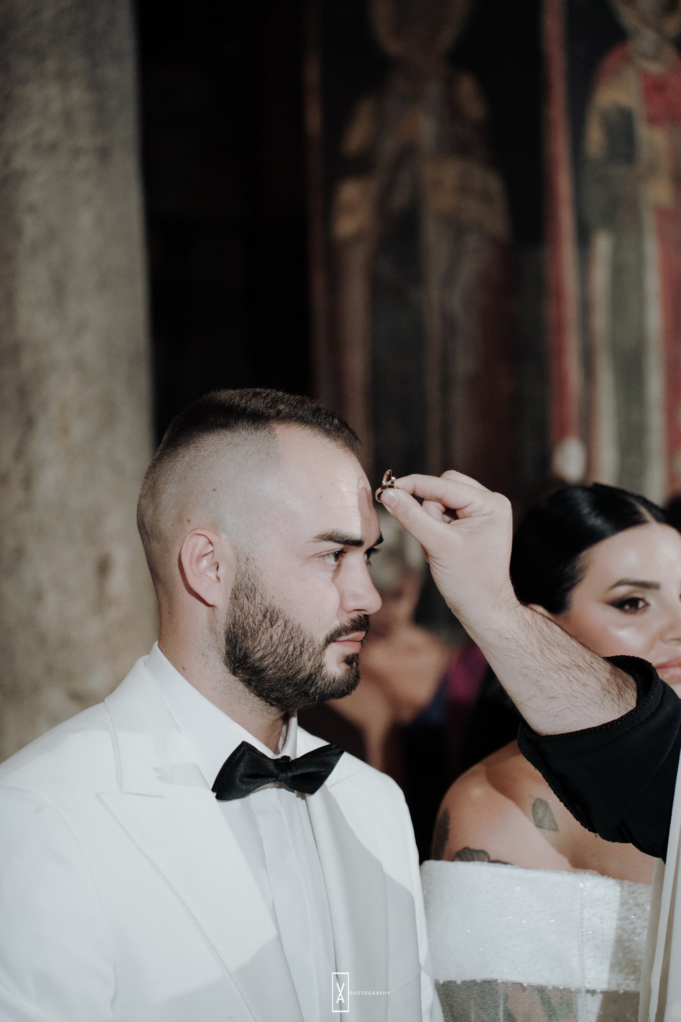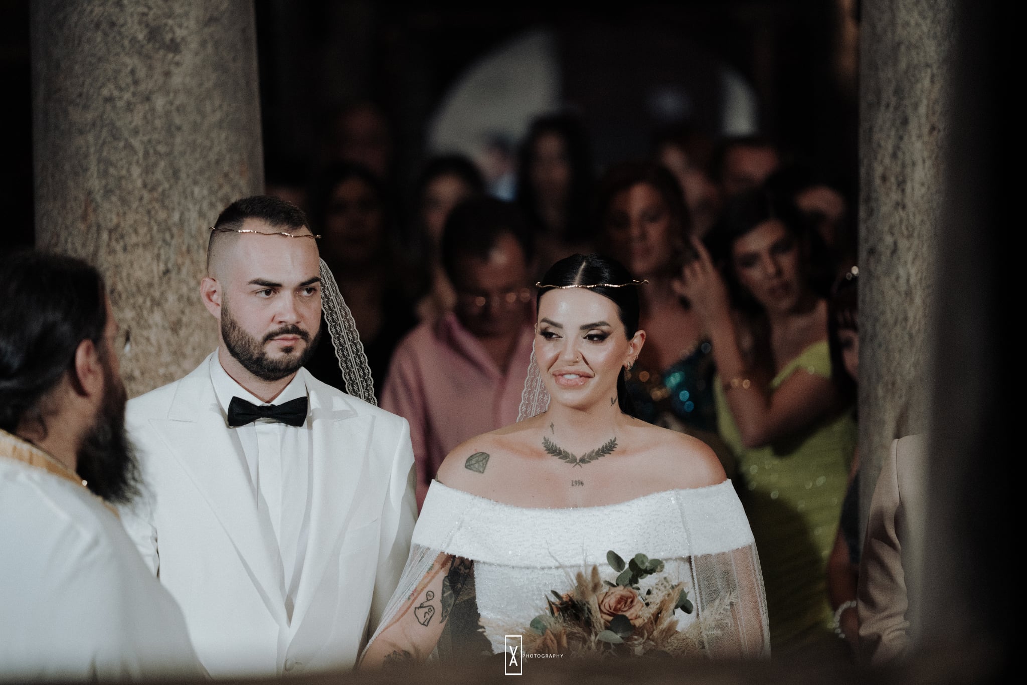 Το νεαρό ζευγάρι στεφάνωσαν ο Άρης Ζερμπίνης και ο Γιάννης Μπασαράς, ενώ οι εκατοντάδες φίλοι τους τους έραναν με ρύζι. Δείτε πως κατέγραψε το Ιερό Μυστήριο το team της V.A. Pgotography: