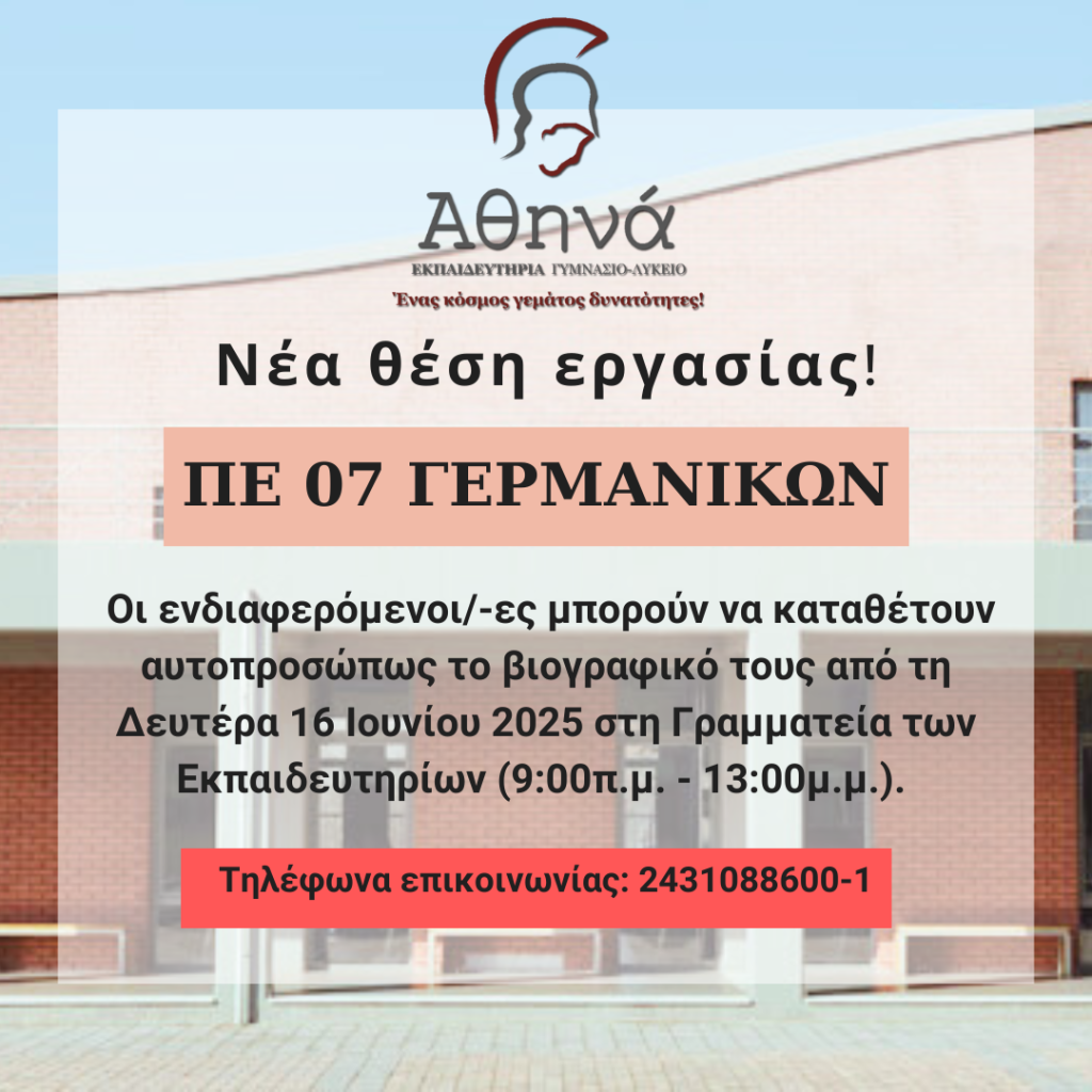 Θέση εργασίας στα Εκπαιδευτήρια ΑΘΗΝΑ Βασίλης Αλεξίου 6 μήνες ago Θέση εργασίας για καθηγητή/καθηγήτρια Γερμανικών στα Εκπαιδευτήρια ΑΘΗΝΑ. Η αγγελία: