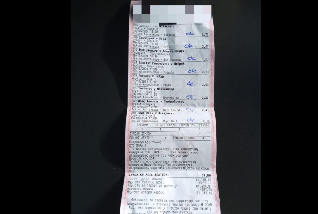 Μεγάλη έμπνευση είχε χθες παίκτης στα Τρίκαλα ο οποίος πόνταρε 1 ευρω σε οκτώ παιχνίδια, τα έπιασε όλα και κέρδισε 1.350 ευρώ!!!
