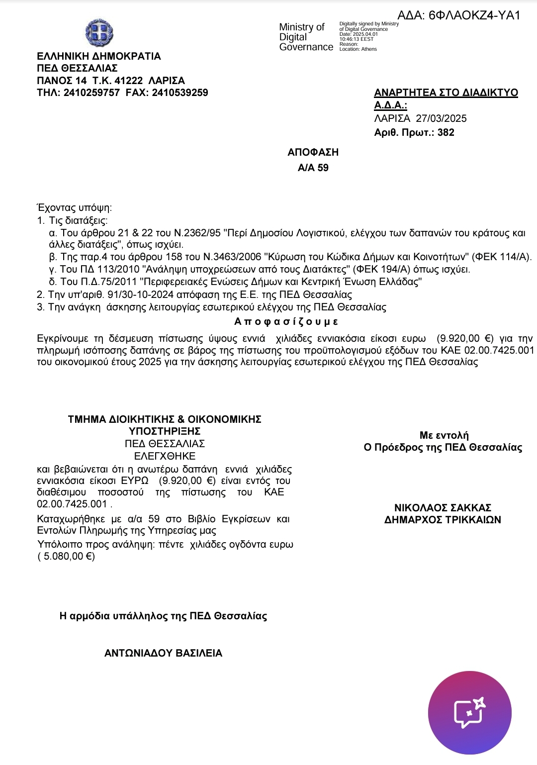Σύμφωνα με απόφαση που αναρτήθηκε στη ΔΙΑΥΓΕΙΑ στις 27 Μαρτίου και αποκαλύπτει το trikalavoice.gr δεσμεύτηκε και ένα ποσό 9.920 € για το σκοπό αυτό. Αναμένουμε διευκρινήσεις: