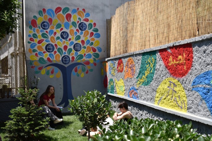 Στην πρώτη τοιχογραφία ζωγράφισαν έναν άνθρωπο που στηρίζει ένα δέντρο. Τo δέντρο βγάζει καρπούς, πολύχρωμα φύλλα όπου μέσα έχουν εικόνες όπως σταυρός, σπίτι, υπολογιστής, φαγητό, μητέρα με παιδί. Πάνω από το δέντρο ζωγράφισαν μια στέγη. Η συγκεκριμένη τοιχογραφία απεικονίζει τις κοινωνικές δομές που βρίσκονται στο κτήριο και είναι η στέγη για ευπαθή ομάδες. Η προσπάθεια αυτών των δομών δίνει καρπούς με τις υπηρεσίες που παρέχει προσεγγίζοντας με αλληλεγγύη τον άνθρωπο.