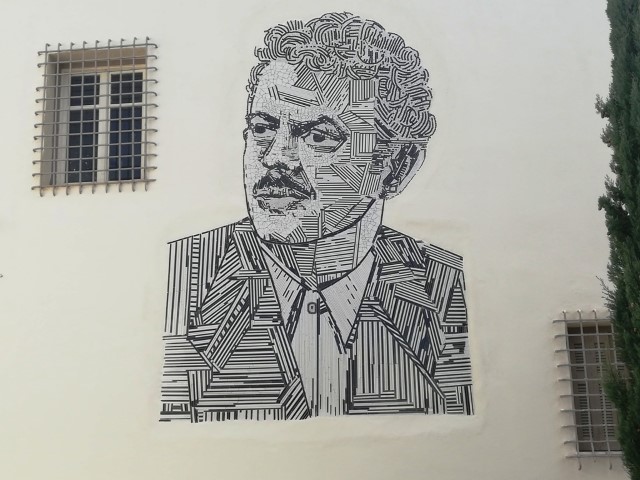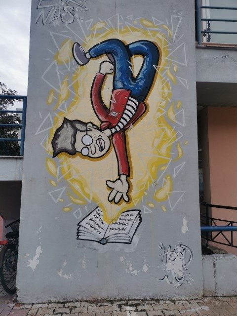 Ο καλλιτέχνης Ιλιον (ΕΤΚ) υλοποιεί ακόμη ένα γκράφιτι, στο πλαίσιο του 5ου Φεστιβάλ Κωμωδίας (18-20 Οκτωβρίου 2024), επίσης στο Πνευματικό Κέντρο Δήμου Τρικκαίων «Αθανάσιος Τριγώνης».