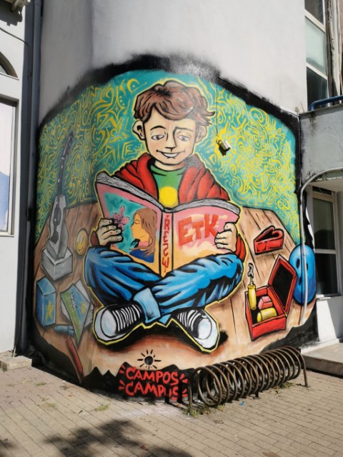 Ακόμη ένα γκράφιτι στο Πνευματικό Κέντρο Δήμου Τρικκαίων «Αθανάσιος Τριγώνης». Το παιδί που διαβάζει, που παίζει, που ασχολείται με τη μουσική και την Τέχνη, το παιδί που είναι παιδί, απεικονίζεται στη νέα αυτή σύνθεση, που φιλοτέχνησε ο καλλιτέχνης Ρεζώ (ΕΤΚ), δίπλα από απεικονίσεις του τρικαλινού συνθέτη Απόστολο Καλδάρα και του τρικαλινού στιχουργού Γιώργου Σαμολαδά. Στο πλαίσιο του 5ου Φεστιβάλ Κωμωδίας, ο Δήμος Τρικκαίων φιλοξένησε τον Σύλλογο ΕΤουΚου και το project Ippokampos, σε μια τριήμερη γιορτή των κόμιξ (18-20 Οκτωβρίου 2024).