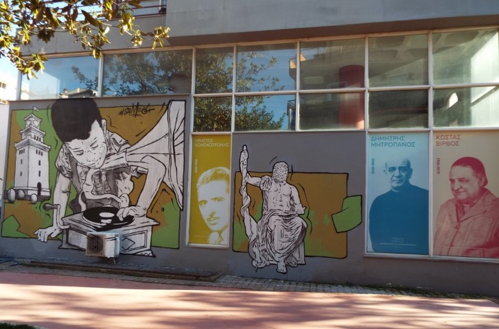 Η περιήγηση του καλλιτέχνη στην πόλη και χωριά, η συνομιλία με κατοίκους, οδήγησαν σε μια όμορφη αποτύπωση στοιχείων του Δήμου, σε ένα hot spot της νεολαίας, την Αυλή Πολιτισμού, που δημιούργησε ο Δήμος Τρικκαίων στον χώρο ανάμεσα στο Λαογραφικό Μουσείο, το Πνευματικό Κέντρο και τη Δημοτική Βιβλιοθήκη. Το έργο αποτυπώνει τη σχέση της πόλης με τη μουσική, ακριβώς ανάμεσα από τις προσωπογραφίες των τρικαλινών καλλιτεχνών, Χρήστου Κολοκοτρώνη, Δημήτρη Μητροπάνου, Κώστα Βίρβου, που κοσμούν τη μία πλευρά του κτηρίου, μαζί με τους Απόστολο Καλδάρα και Γιώργο Σαμολαδά. Ταυτοχρόνως, αποτυπώνεται το διάσημο Ρολόι – σήμα κατατεθέν – στο Φρούριο, αλλά και ο Ασκληπιός, ο πρώτος γιατρός της αρχαιότητας.