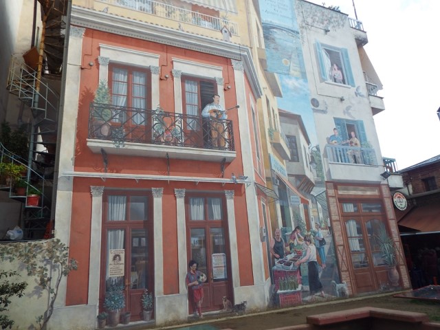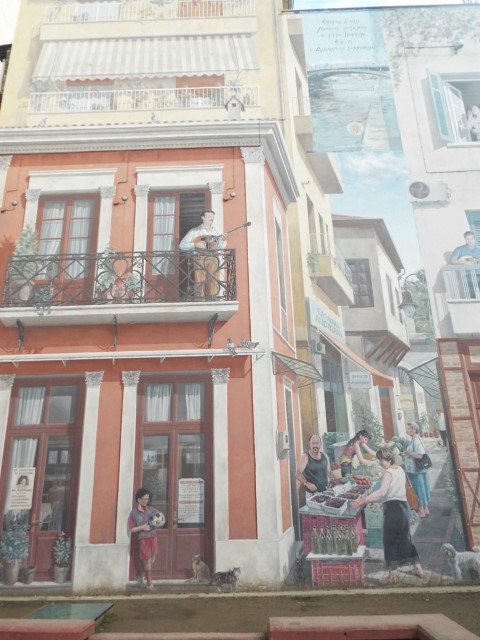 Η αρχή έγινε το 2006. Στις Οκτωβρίου ολοκληρώθηκε στα «μανάβικα» μια τοιχογραφία σε επιφάνεια 150μ2 . Είναι η απεικόνιση στοιχείων των Τρικάλων με τη μέθοδο της «αρχιτεκτονικής οφθαλμαπάτης», από τους Γάλλους καλλιτέχνες της Cite de la Creation, στο πλαίσιο του διακρατικού προγράμματος «Ολοκληρωμένες Παρεμβάσεις Αστικής Ανάπτυξης σε Τοπικές Ζώνες Μικρής Κλίμακας», που ανέλαβε το Π.Ε.Π. Θεσσαλίας και η Τεχνική Υπηρεσία του Δήμου Τρικκαίων στο επιμέρους πρόγραμμα για την αισθητική ανάπλαση όψεων των κτιρίων. Το έργο υλοποίησαν, η εταιρεία SACVL, οι ζωγράφοι της εταιρείας Cite de la Creation και οι ηλεκτρολόγοι της εταιρείας ΗΤΕ. Η τοιχογραφία είναι μοναδική στα Τρίκαλα αλλά και στην Ελλάδα. Αποδίδει με ρεαλιστικό τρόπο την αναπαράσταση της καθημερινότητάς μας. Εικόνες από τα μπαλκόνια των σπιτιών, η ταβέρνα και το μουσικό της πρόγραμμα, οι τραγουδοποιοί στα μπαλκόνια, η λαϊκή αγορά με τις νοικοκυρές να κάνουν τα ψώνια τους, τα παιδιά ανέμελα στο παιχνίδι της γειτονιάς. Εικόνες απλές, καθημερινές αλλά και τόσο προσφιλείς.