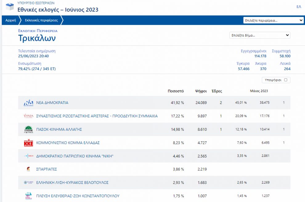 Ανατροπή με τις έδρες στα Τρίκαλα καθώς η Ν.Δ. κερδίζει και 2η έδρα.
