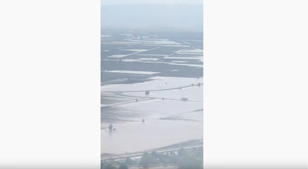 Ο κάμπος έχει μετατραπεί σε μια απέραντη λίμνη καταστρέφοντας ολοσχερώς αγροτικές καλλιέργειες. Οι εικόνες είναι από ελικόπτερο που πέταξε πάνω απ’ τις πληγείσες περιοχές το μεσημέρι του Σαββάτου.