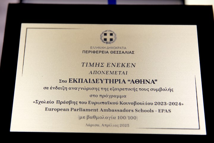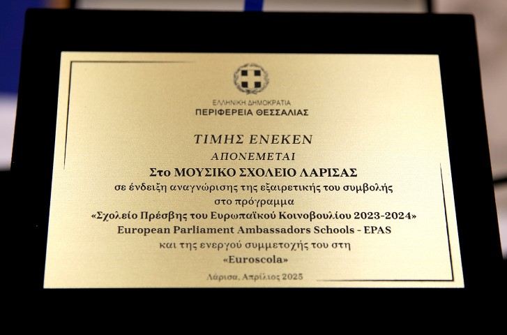 Τη διάκριση της νέας γενιάς στην Ευρώπη γιόρτασε η Περιφέρεια Θεσσαλίας, σε ειδική εκδήλωση που πραγματοποιήθηκε σήμερα το πρωί, στην Αίθουσα του Περιφερειακού Συμβουλίου. Το Μουσικό Σχολείο Λάρισας και τα Εκπαιδευτήρια «Αθηνά» απέσπασαν την ανώτατη βαθμολογία 100/100 στο ευρωπαϊκό πρόγραμμα «Σχολεία-Πρέσβεις του Ευρωπαϊκού Κοινοβουλίου» (European Parliament Ambassador Schools – EPAS) στο πλαίσιο του προγράμματος Euroscola, για το σχολικό έτος 2023-2024.