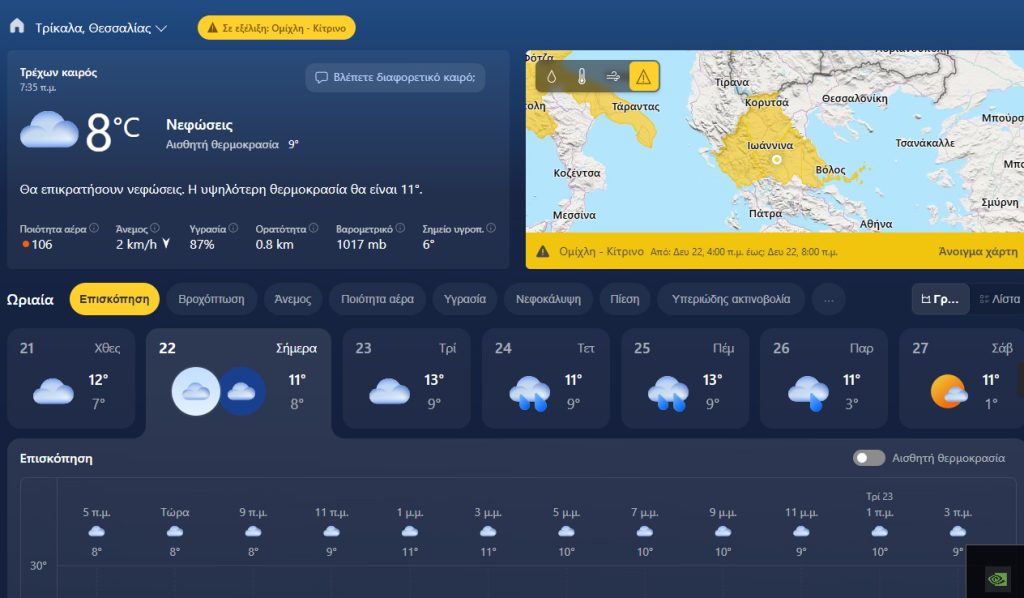 Άστατος ο καιρός τα Χριστούγεννα στην χώρα μας με βροχές καταιγίδες και λίγα χιόνια στα ορεινά – ορεινά. Ειδικότερα στα Τρίκαλα αναμένονται βροχές από την παραμονή των Χριστουγέννων και μέχρι την Παρασκευή.