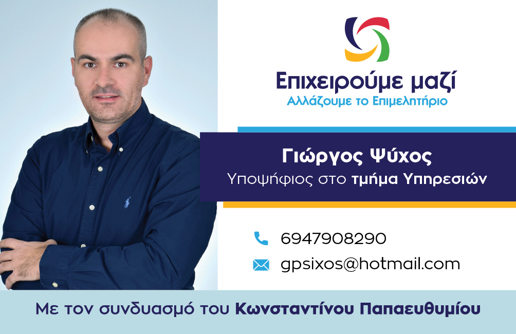 Ο λογιστής Γιώργος Ψύχος, γιος του πρώην αντιδημάρχου Τρικκαίων Κώστα Ψύχου, κατέρχεται υποψήφιος για το Δ.Σ. του Επιμελητηρίου Τρικάλων, όντας υποψήφιος στο Τμήμα Υπηρεσιών με τον συνδυασμό “Επιχειρούμε μαζί” του Κωνσταντίνου Παπαευθυμίου.