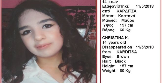 Στις 11/5/2018, στις 17:00 ώρα, εξαφανίστηκε από το σπίτι της στην Αχλαδιά Καρδίτσας, η Χριστίνα Κ., 14 ετών.