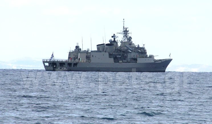 Μια φρεγάτα του Πολεμικού Ναυτικού που βρίσκεται αγκυροβολημένη στον κόλπο της Νάουσας