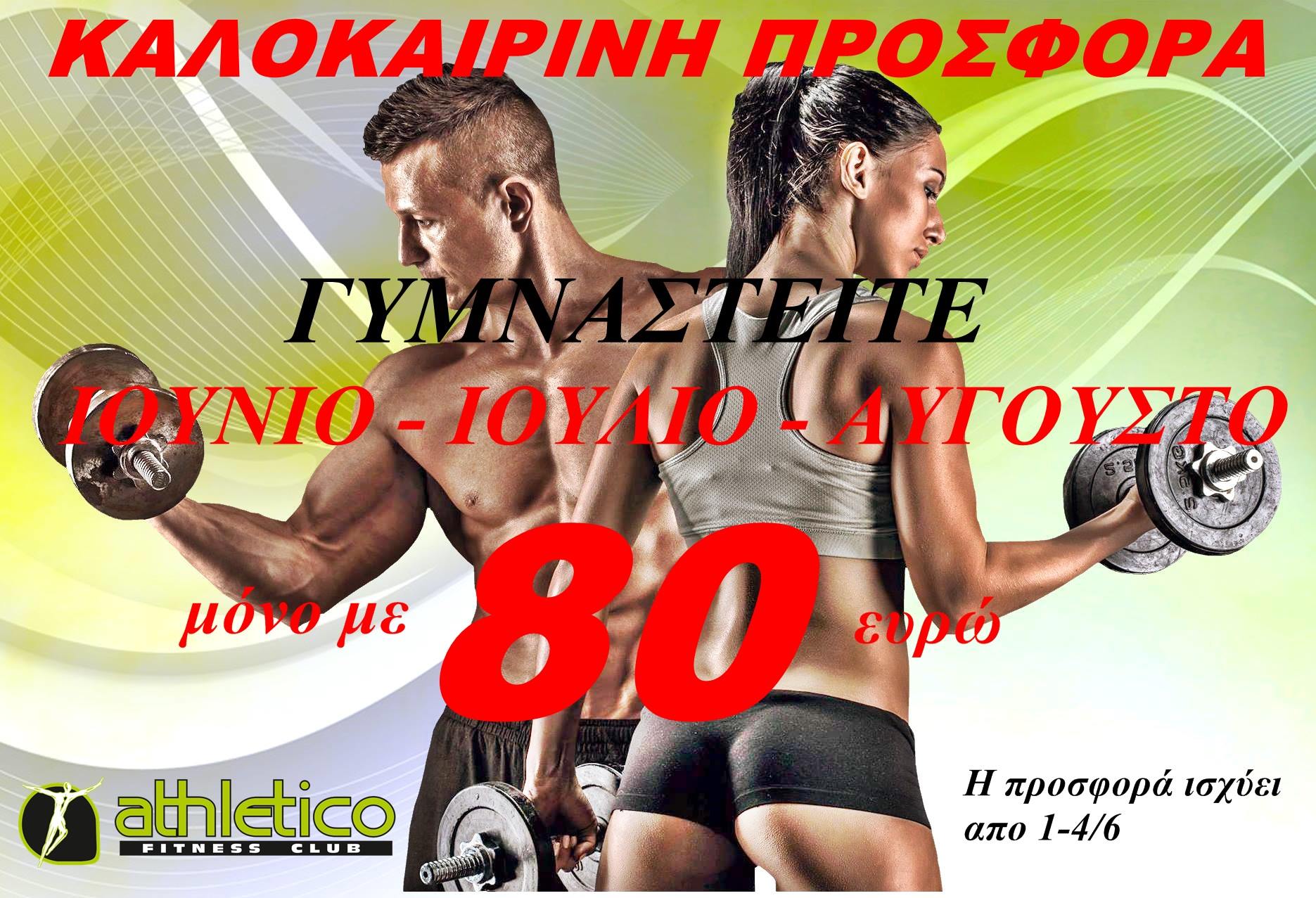 Το ATHLETICO FITNESS CLUB σας δίνει την δυνατότητα να γυμναστείτε το καλοκαιρινό 3μηνο ΙΟΥΝΙΟ-ΙΟΥΛΙΟ-ΑΥΓΟΥΣΤΟ ΜΟΝΟ με 80 ευρώ.